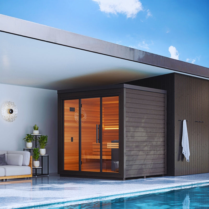 • Sophisticated Design. The 5-Person Outdoor Sauna boasts a luxurious interior of Thermo-aspen wood, imparting a calming and elegant atmosphere.