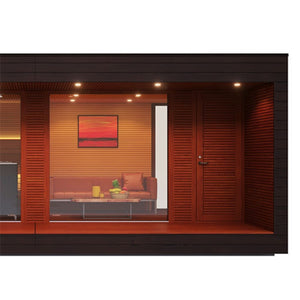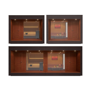 The Natura Lounge is a fully assembled module that is designed to complement the Natura outdoor sauna cabin. With its elegant appearance, it creates a sense of luxury and spaciousness, making it the perfect place for gatherings and relaxation for friends and family. Additionally, the lounge features an expansive triple-glazed tempered picture window, allowing for a full view of nature while transitioning into the sauna.
