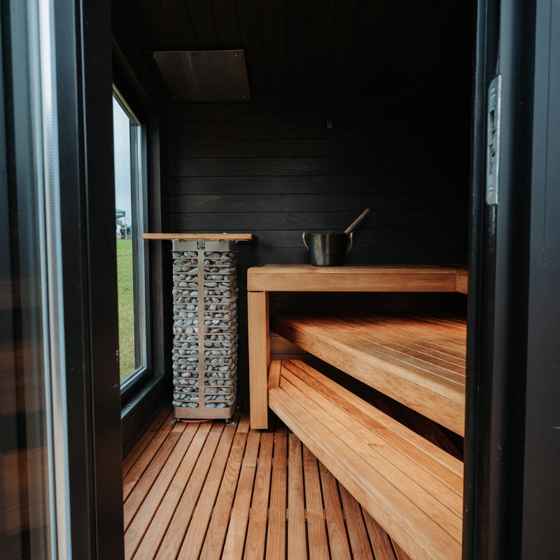 The Terra is a universally-styled, spacious outdoor sauna model that will be the escape you need, right at home. This sauna is available in a thermo-pine exterior and has the option of left and right-handed door hinges when purchasing. Additionally, the Terra comes in a small or medium size to best fit your needs. This beautiful sauna is delivered fully assembled and ready to use.