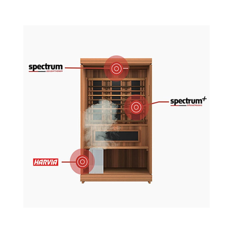 The Trinity Combination Sauna is the only sauna available that combines Finnmark’s UL listed Spectrum Plus infrared heaters combined with a traditional 120V sauna heater, plus true medical grade Spectrum Red Light™ Therapy.