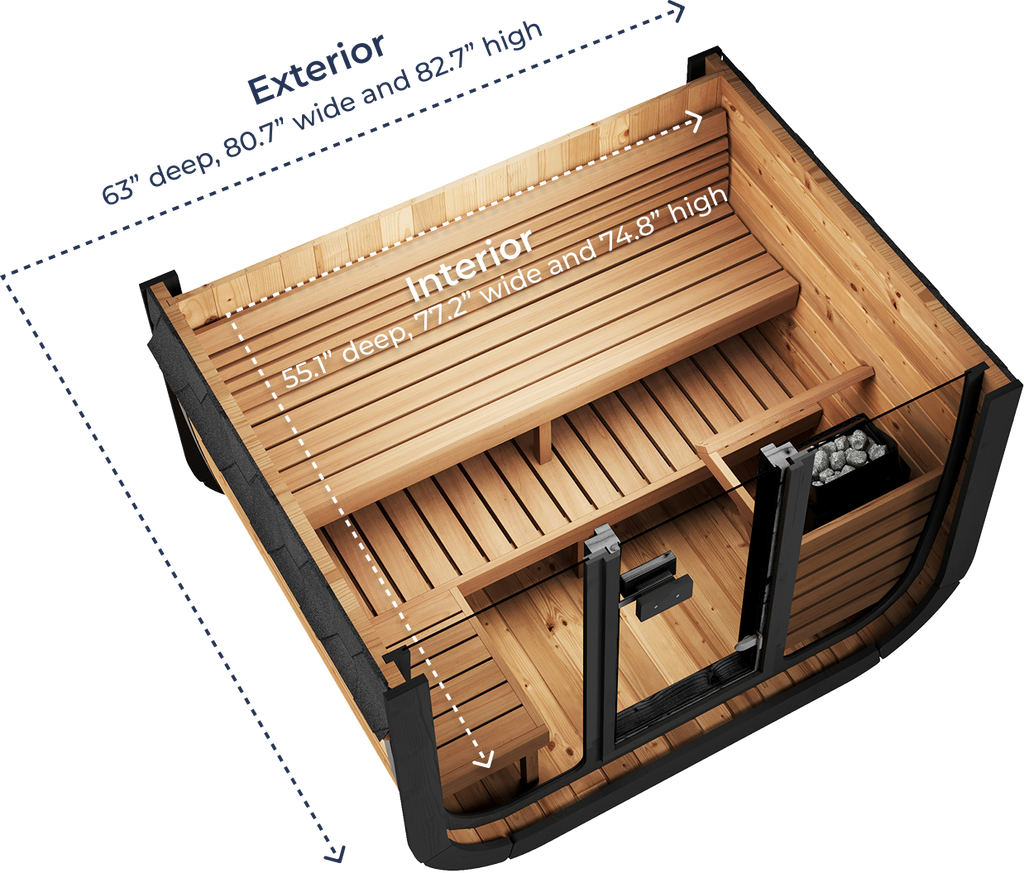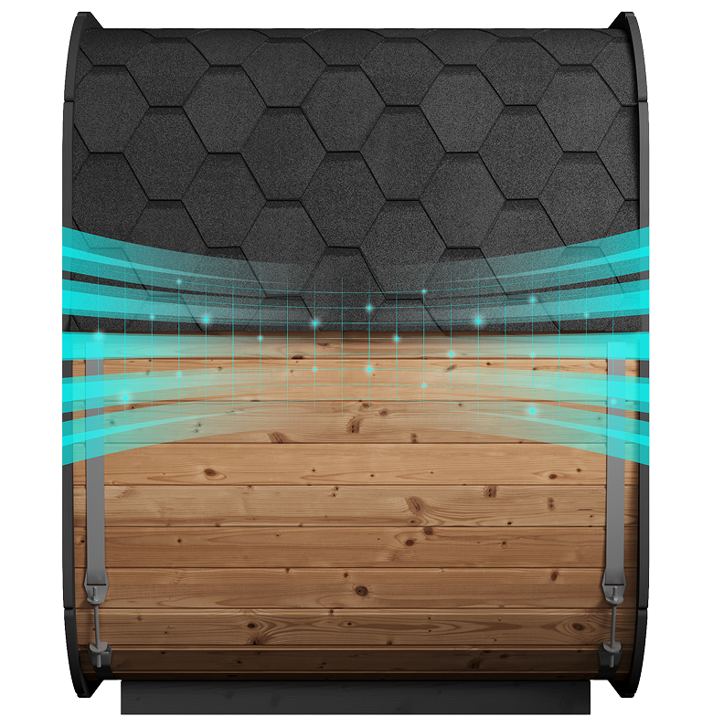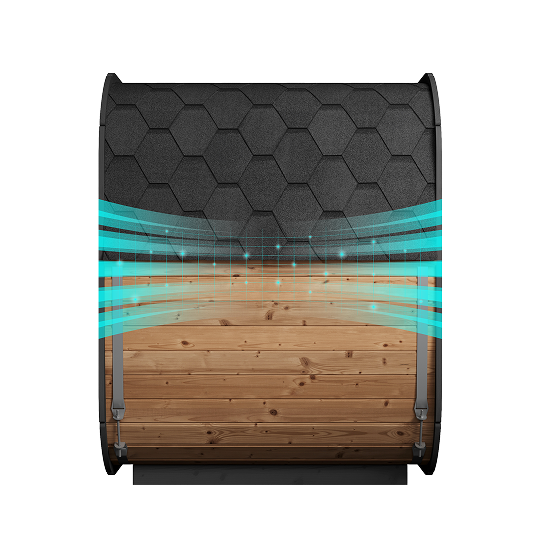 The sauna features a beautiful and durable Thermo-Spruce exterior, known for its excellent heat resistance and longevity. This material not only ensures the sauna's durability but also gives it a natural, appealing look.