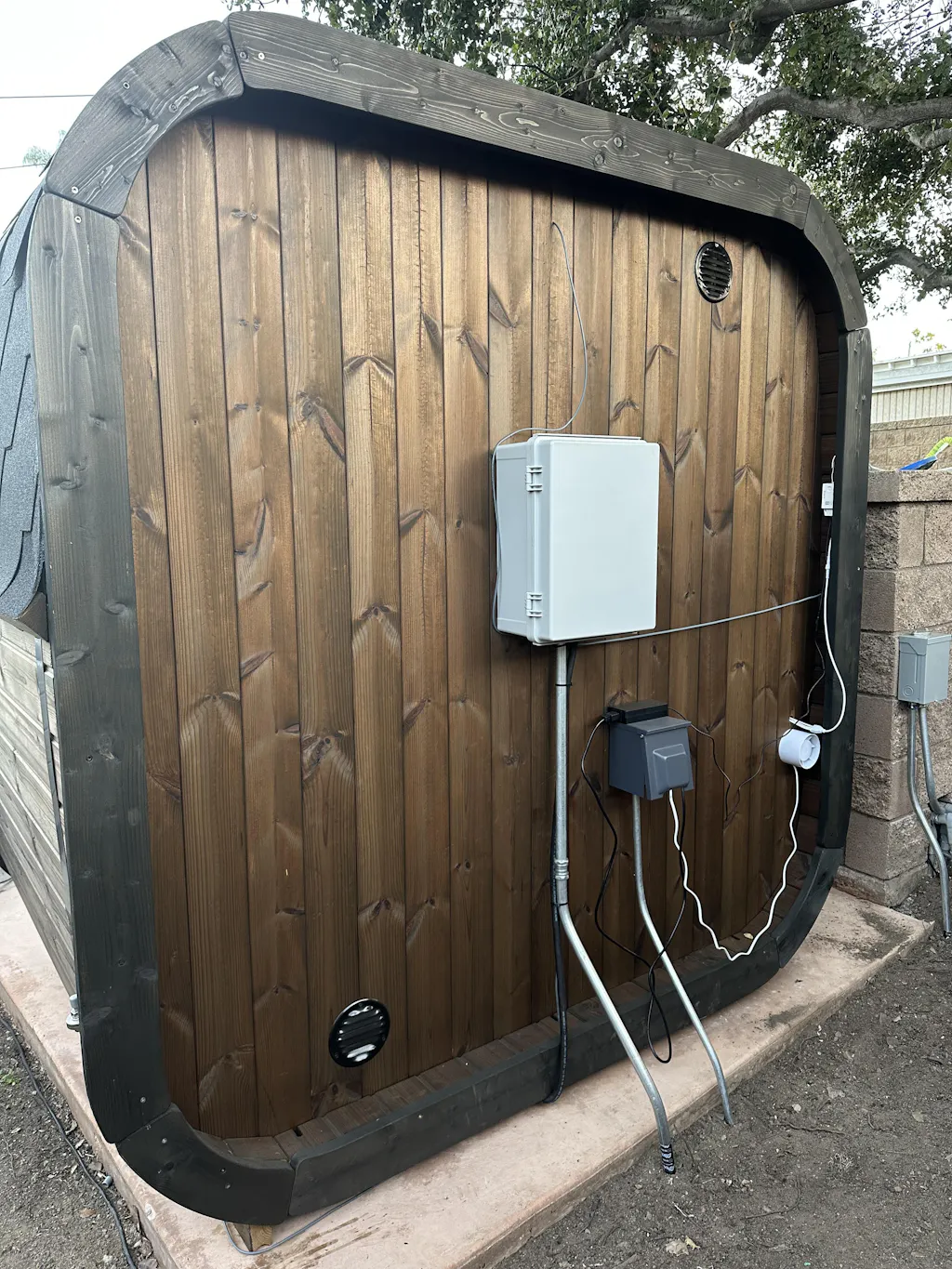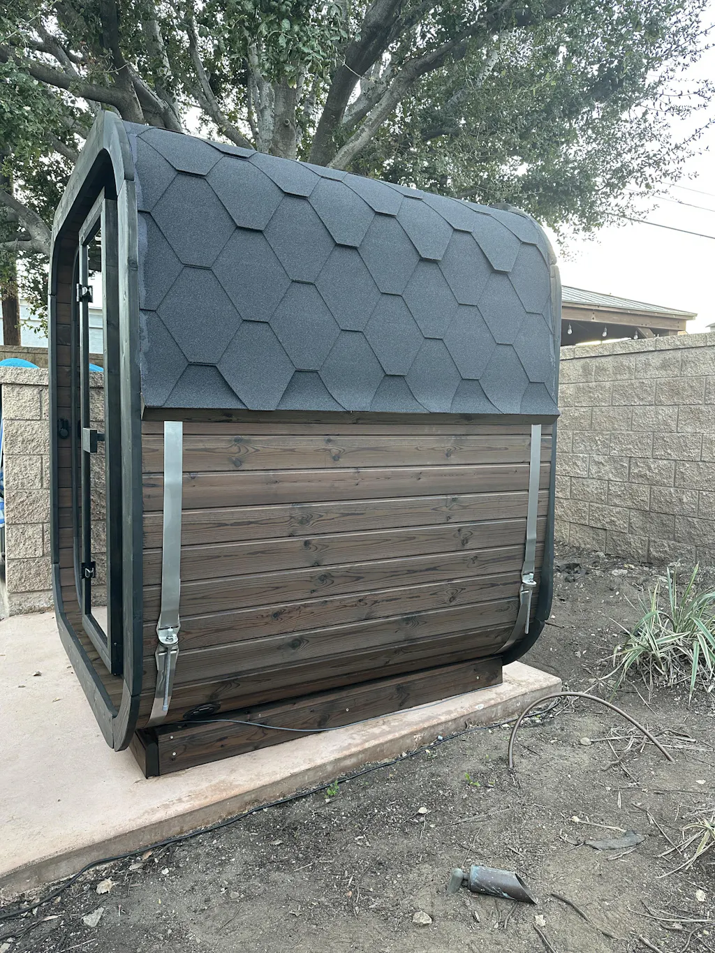 It’s very traditional looking and fits so nicely on the side of our house. We also had our first rain last week where it dumped and the roof and everything held up beautifully as you can see there’s a step under the sauna, and that did not come with a kit my contractor built that out of the extra wood as they do send a couple of extra pieces in case there’s any damage and shipment.
